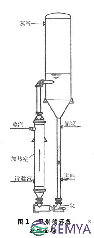 強(qiáng)制循環(huán)蒸發(fā)結(jié)晶器 一種晶漿循環(huán)式連續(xù)結(jié)晶器(圖1)。操作時(shí),料液自循環(huán)管下部加入,與離開(kāi)結(jié)晶室底部的晶漿混合后,由泵送往加熱室。晶漿在加熱室內(nèi)升溫(通常為2~6℃),但不發(fā)生蒸發(fā)。熱晶漿進(jìn)入結(jié)晶室后沸騰,使溶液達(dá)到過(guò)飽和狀態(tài),于是部分溶質(zhì)沉積在懸浮晶粒表面上,使晶體長(zhǎng)大。作為產(chǎn)品的晶漿從循環(huán)管上部排出。強(qiáng)制循環(huán)蒸發(fā)結(jié)晶器生產(chǎn)能力大,但產(chǎn)品的粒度分布較寬。