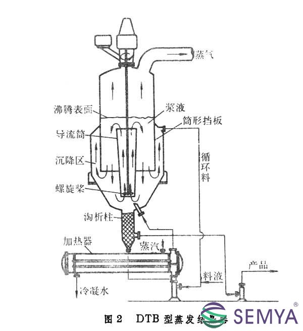 DTB型蒸發(fā)結(jié)晶器 即導(dǎo)流筒-擋板蒸發(fā)結(jié)晶器,也是一種晶漿循環(huán)式結(jié)晶器(見(jiàn)彩圖)。器下部接有淘析柱,器內(nèi)設(shè)有導(dǎo)流筒和筒形擋板,操作時(shí)熱飽和料液連續(xù)加到循環(huán)管下部,與循環(huán)管內(nèi)夾帶有小晶體的母液混合后泵送至加熱器。加熱后的溶液在導(dǎo)流筒底部附近流入結(jié)晶器,并由緩慢轉(zhuǎn)動(dòng)的螺旋槳沿導(dǎo)流筒送至液面。溶液在液面蒸發(fā)冷卻,達(dá)過(guò)飽和狀態(tài),其中部分溶質(zhì)在懸浮的顆粒表面沉積,使晶體長(zhǎng)大。在環(huán)形擋板外圍還有一個(gè)沉降區(qū)。在沉降區(qū)內(nèi)大顆粒沉降,而小顆粒則隨母液入循環(huán)管并受熱溶解。晶體于結(jié)晶器底部入淘析柱。為使結(jié)晶產(chǎn)品的粒度盡量均勻,將沉降區(qū)來(lái)的部分母液加到淘析柱底部,利用水力分級(jí)的作用,使小顆粒隨液流返回結(jié)晶器,而結(jié)晶產(chǎn)品從淘析柱下部卸出(圖2)。