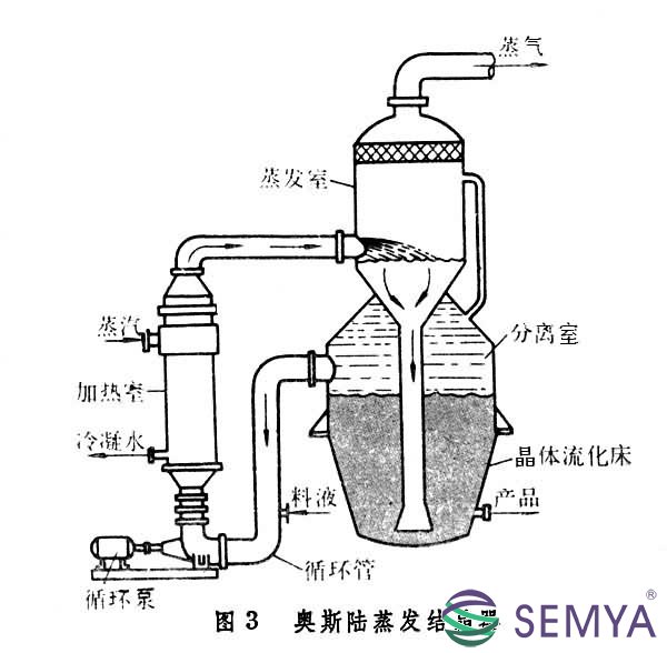 奧斯陸型蒸發(fā)結(jié)晶器 又稱(chēng)為克里斯塔爾結(jié)晶器, 一種母液循環(huán)式連續(xù)結(jié)晶器(圖3)。操作的料液加到循環(huán)管中,與管內(nèi)循環(huán)母液混合,由泵送至加熱室。加熱后的溶液在蒸發(fā)室中蒸發(fā)并達(dá)到過(guò)飽和,經(jīng)中心管進(jìn)入蒸發(fā)室下方的晶體流化床(見(jiàn)流態(tài)化)。在晶體流化床內(nèi),溶液中過(guò)飽和的溶質(zhì)沉積在懸浮顆粒表面,使晶體長(zhǎng)大。晶體流化床對(duì)顆粒進(jìn)行水力分級(jí),大顆粒在下,而小顆粒在上,從流化床底部卸出粒度較為均勻的結(jié)晶產(chǎn)品。流化床中的細(xì)小顆粒隨母液流入循環(huán)管,重新加熱時(shí)溶去其中的微小晶體。若以冷卻室代替奧斯陸蒸發(fā)結(jié)晶器的加熱室并除去蒸發(fā)室等,則構(gòu)成奧斯陸冷卻結(jié)晶器。這種設(shè)備的主要缺點(diǎn)是溶質(zhì)易沉積在傳熱表面上,操作較麻煩,因而應(yīng)用不廣泛。