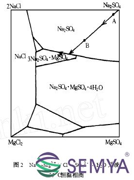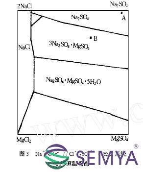無水硫酸鈉生產(chǎn)所使用的原料中,除了主要的Na+ 、SO42 -離子外,一般都含有少量的Ca2 + 、Mg2 + 、和Cl -離子,生產(chǎn)時(shí)蒸發(fā)器內(nèi)壓力、溫度等條件保持不變,隨著蒸發(fā)的進(jìn)行,結(jié)晶的硫酸鈉不斷取出, 料液中Ca2 + 、Mg2 + 離子濃度相對(duì)增大, 體現(xiàn)在Na + 、Mg2 + // Cl -、SO42--H2O 相圖上,如開始在A 點(diǎn),生產(chǎn)一段時(shí)間后體系移到B 點(diǎn)見圖2, 繼續(xù)生產(chǎn),體系逐漸由Na2SO4 的結(jié)晶區(qū)移到Na2SO4 與復(fù)鹽3Na2SO4 ·MgSO4 的共飽線上,此時(shí)無水鈉鎂礬開始析出,在操作溫度不變情況下,體系將沿此共飽線移動(dòng),產(chǎn)品質(zhì)量開始下降。如果溫度升高時(shí),Na2SO4 的結(jié)晶區(qū)逐漸縮小,而3Na2SO4 ·MgSO4 的結(jié)晶區(qū)逐漸增大, 體系落在了3Na2SO4 ·MgSO4的結(jié)晶區(qū),顯然此時(shí)已不是我們所需要的產(chǎn)品了見圖3 。由于無水鈉鎂礬的結(jié)晶顆細(xì)小,在粘度較大的硫酸鈉溶液中不易沉降,蒸發(fā)罐內(nèi)就會(huì)呈現(xiàn)糊狀,使蒸發(fā)無法正常進(jìn)行,結(jié)晶也不會(huì)再繼續(xù)長大,排出的料液經(jīng)離心機(jī)脫水非常困難,濕硝中母液含量較大,氣流干燥也無法正常運(yùn)行,產(chǎn)品放置時(shí)間長了便結(jié)為大塊。為避免上述現(xiàn)象發(fā)生,除對(duì)硝液進(jìn)行凈化外,應(yīng)適當(dāng)降低排料溫度,即降低蒸發(fā)終溫。從圖2 、圖3 中可以看出,Na2SO4的結(jié)晶區(qū)隨著溫度的降低而增大,這不僅提高了產(chǎn)品產(chǎn)量,而且極大的降低了雜鹽的析出量,大大提高了產(chǎn)品質(zhì)量。那么是不是排料溫度越低越好呢? 也不是,圖4 是Na2SO4 -H2O 系統(tǒng)相圖,從圖中可以看出,硫酸鈉溶解度在32138 ℃最大,低于此溫度時(shí),系統(tǒng)不再結(jié)晶Na2 SO4 , 而是結(jié)晶出Na2 SO4 ·10H2O 。當(dāng)料液溫度接近32138 ℃時(shí), 由于硫酸鈉溶解度增大,產(chǎn)量將受到影在水中響, 這對(duì)生產(chǎn)是不利的。